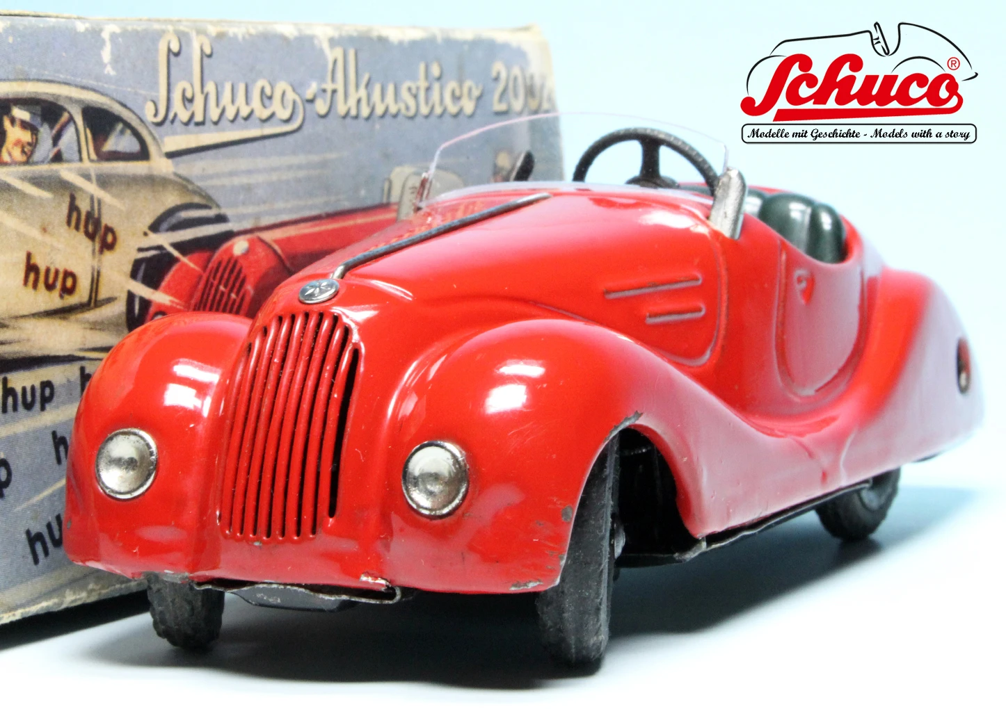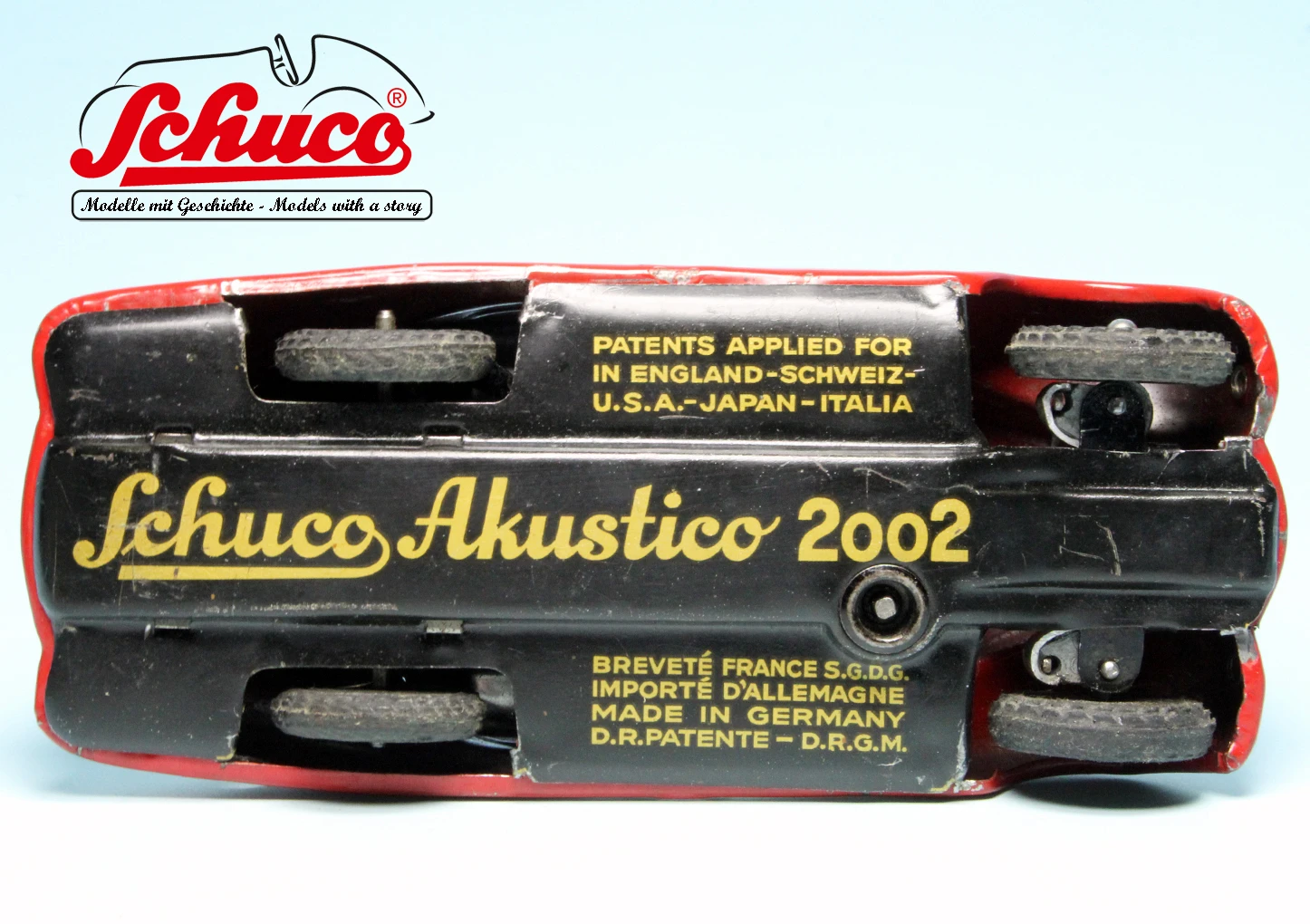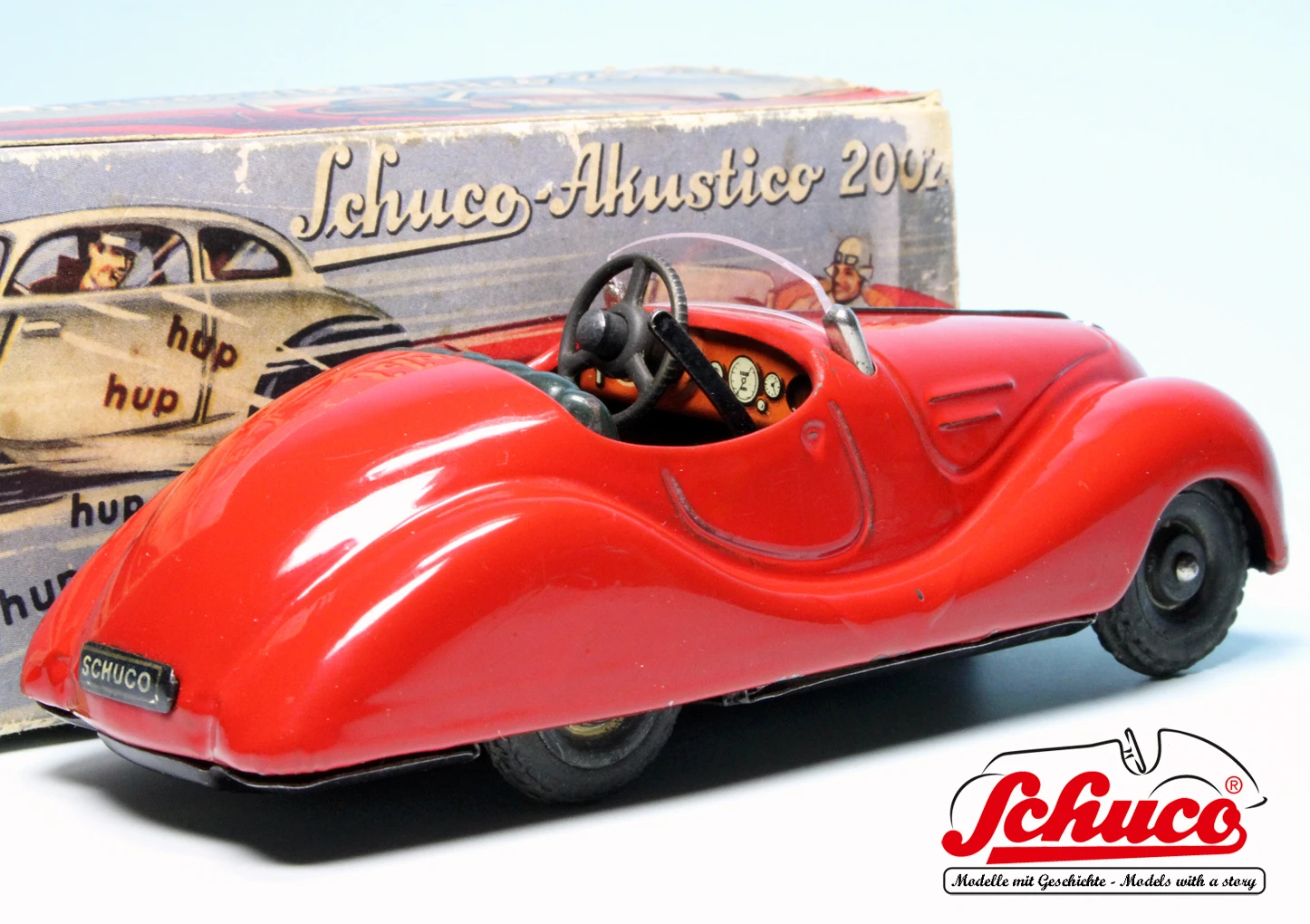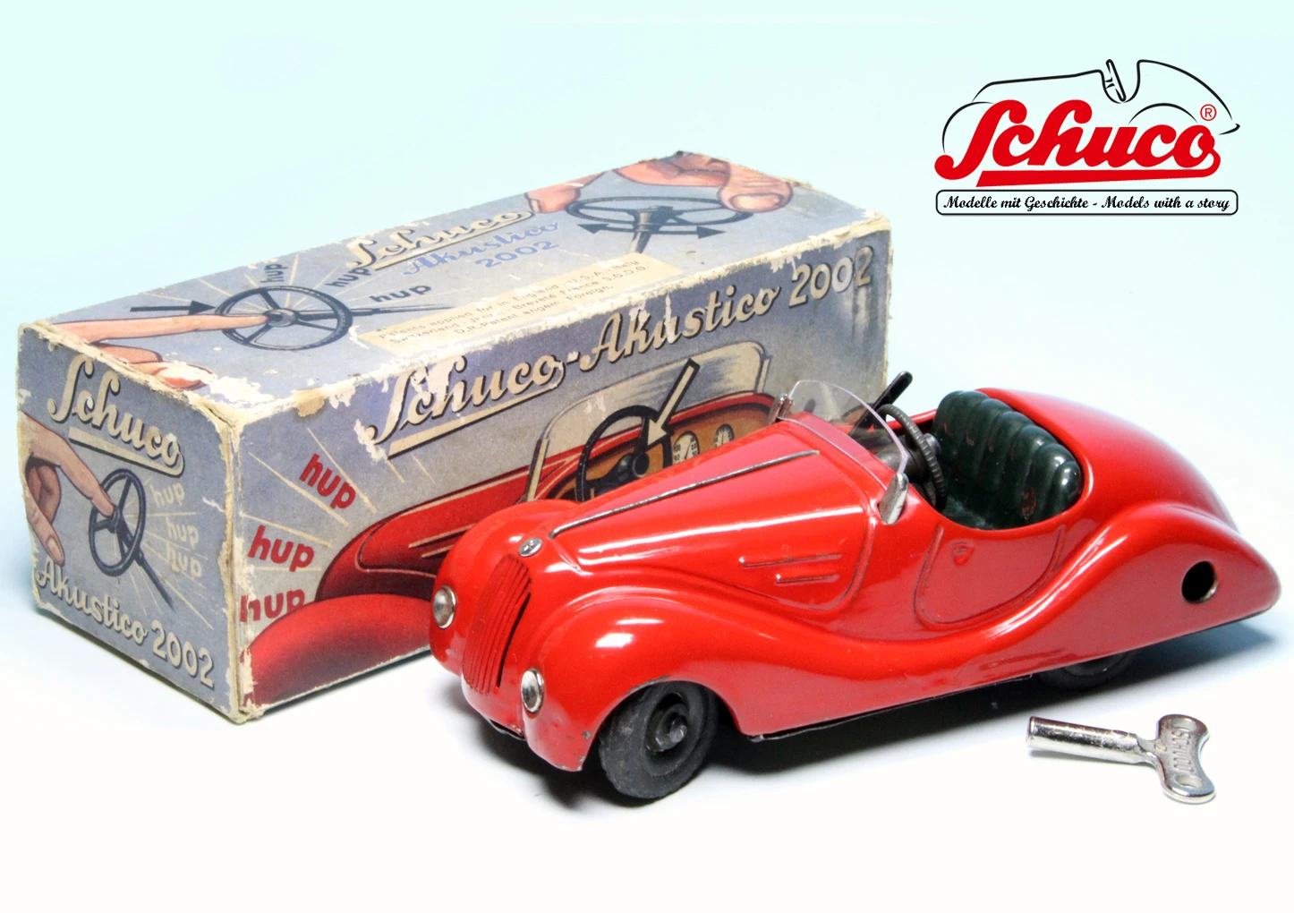 Das große Vorbild des Schuco Akustico 2002 ist der legendäre BMW 328 Roadster und wahrscheinlich eines der bekanntesten Schuco-Modelle. Der Akustico 2002 erhielt erstmals vor dem Zweiten Weltkrieg im Jahr 1939 Einzug in das Schuco Sortiment, wurde zunächst bis 1959 gebaut und kam in den 1980er Jahren ein zweites Mal in das Schuco-Sortiment. Er verfügt über insgesamt zwei Uhrwerke für Fahrt und Hupe, eine funktionsfähige Lenkung sowie über eine Handbremse. Wenn das zweite Uhrwerk voll aufgezogen ist, können etwa 300 Hupsignale gegeben werden.