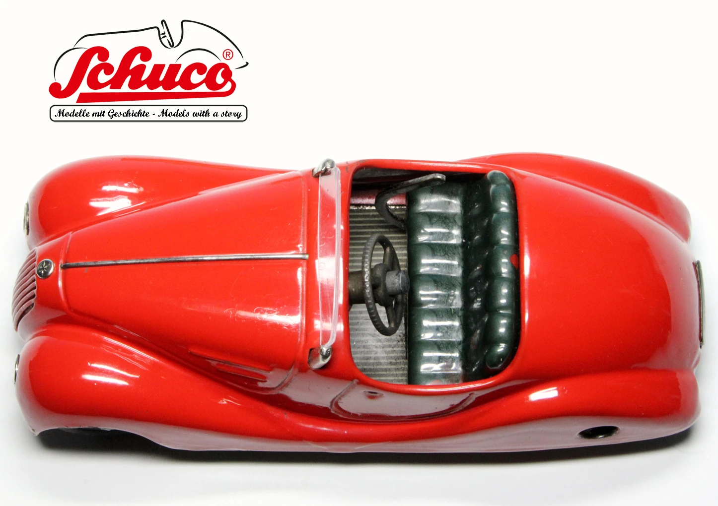 Baujahr Vorkrieg ca. 1930er Jahre, in Farbe rot mit dunkelgrünen Sitzen, schöne Lackierung mit einigen wenigen Spielspuren, insgesamt wunderschöner Erhaltungszustand, alle Funktionen einwandfrei und getestet, Markierung auf der Bodenplatte „Made in Germany“ in goldener Schrift, alle verbauten Teile mit Ausnahme der Windschutzscheibe sind dem Baujahr des Modells entsprechend, mit original Umkarton Umkarton mit einer fehlenden Seitenlasche.