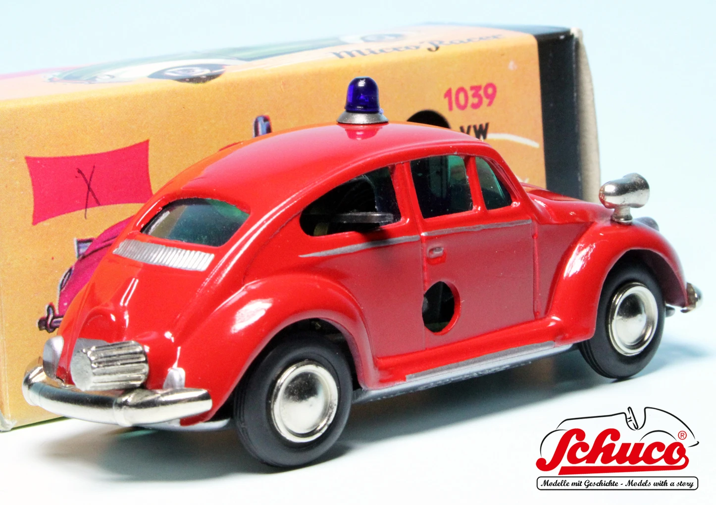 Baujahr ca. 1980er Jahre, in Farbe rot, wunderschöner und fabrikneuer Zustand ohne Spielspuren, alle Funktionen einwandfrei und getestet, auf der Unterseite gemarkt mit „Made in Western Germany“, alle verbauten Teile sind dem Baujahr des Modells entsprechend, in seltener Ausführung mit silberner Bodenplatte, in der späteren Nutz-Ausführung ohne „Schuco“-Logo auf der Unterseite und dem Karton, mit kleinem original „Spiel-Nutz“ Aufzugschlüssel und original Umkarton.