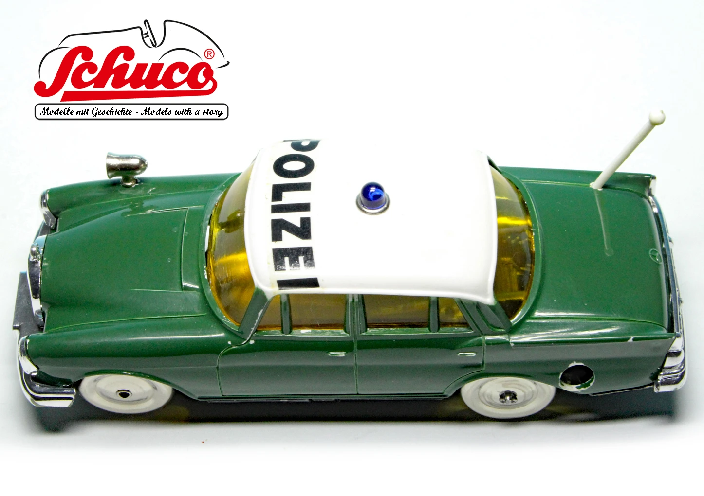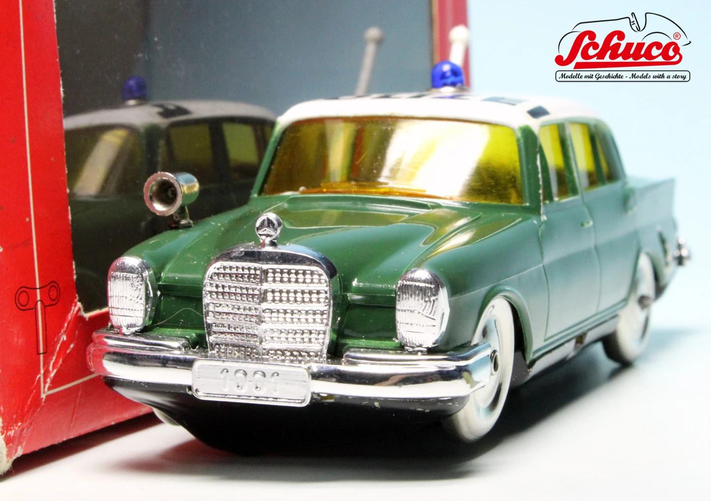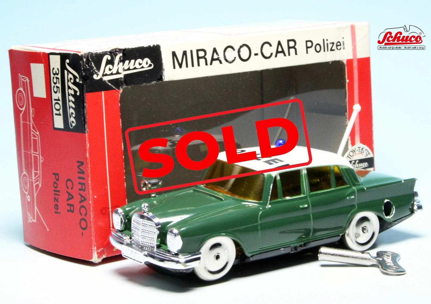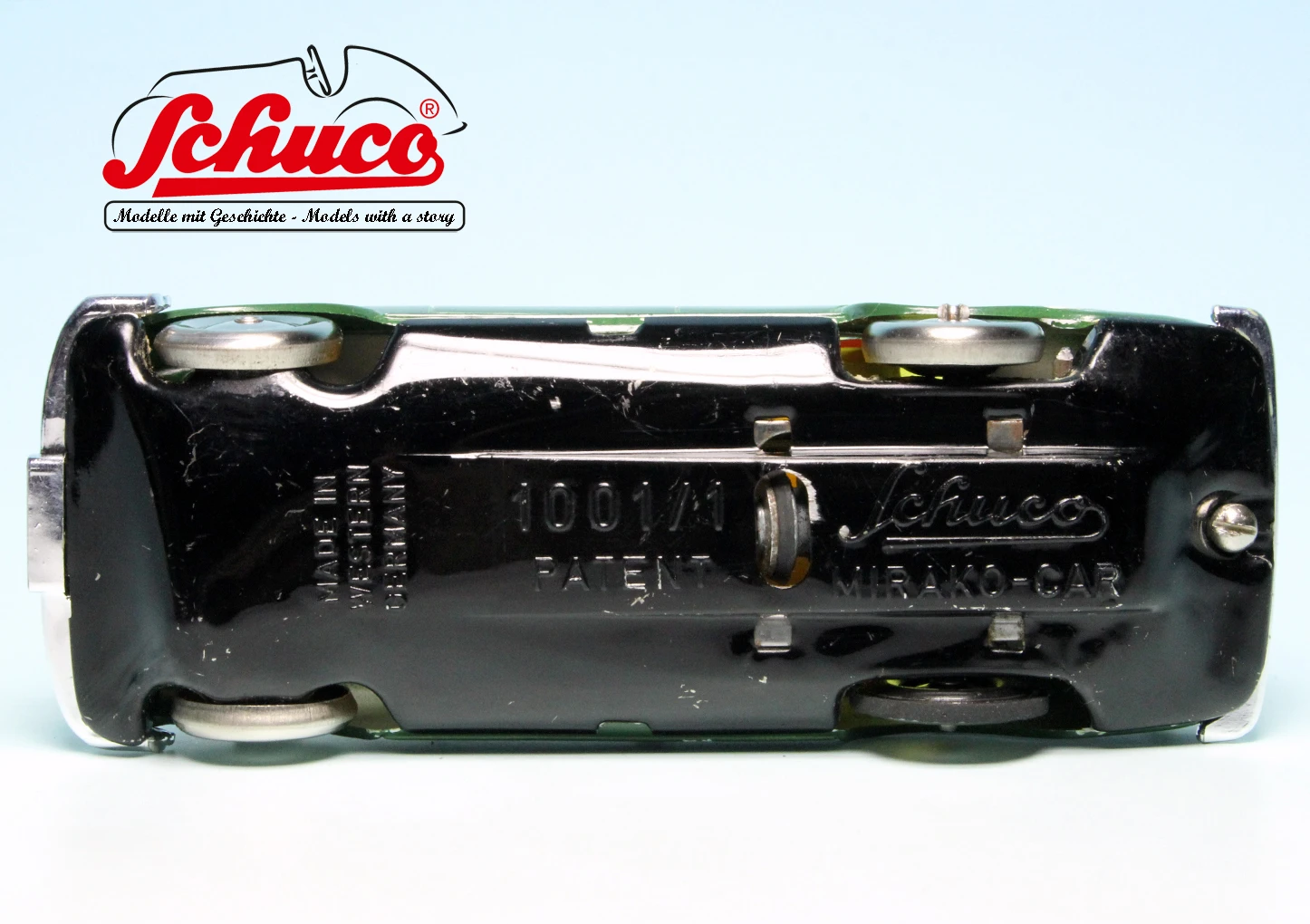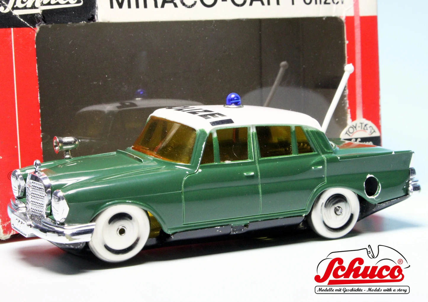 Das Schuco Mirakocar 1001/1 -später auch mit der Artikelnummer 351100 geführt- Mercedes Benz 220SE Heckflosse erhielt erstmals 1965 Einzug in das Schuco Sortiment und wurde bis einschließlich 1975 gebaut. Er verfügt über einen Uhrwerkmechanismus, der das rechte Hinterrad und ein querstehendes Rad in der Mitte des Fahrzeugs antreibt. Sobald das Fahrzeug über eine Tischkante fährt, dreht es automatisch nach links weg und fällt somit nicht herunter (sogenannte „Wendefunktion“). Die Karosserie des Modells ist aus Kunststoff, die Bodenplatte aus Blech gefertigt. Eine Neuauflage dieses Modells gabe es seit der Einstellung nicht mehr.