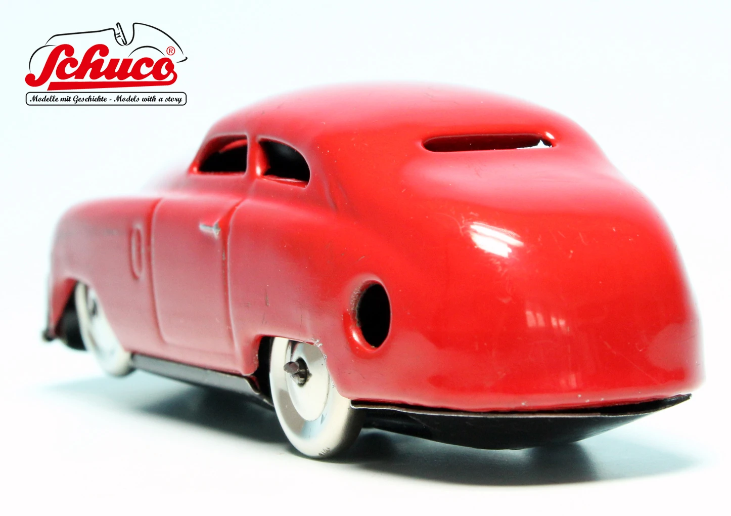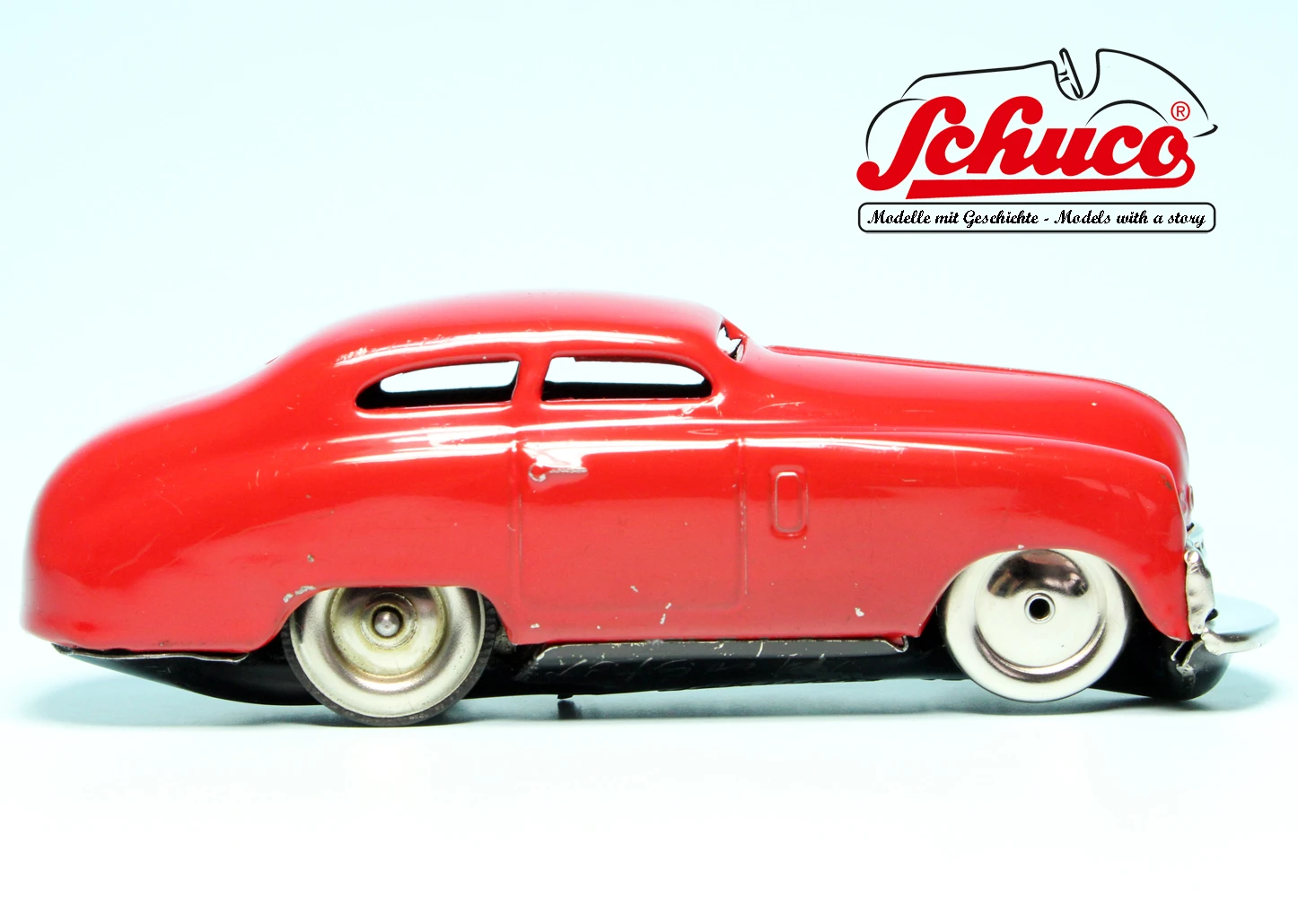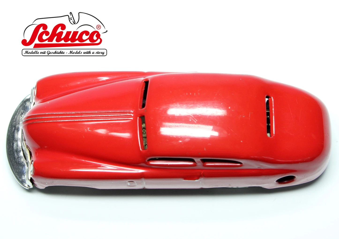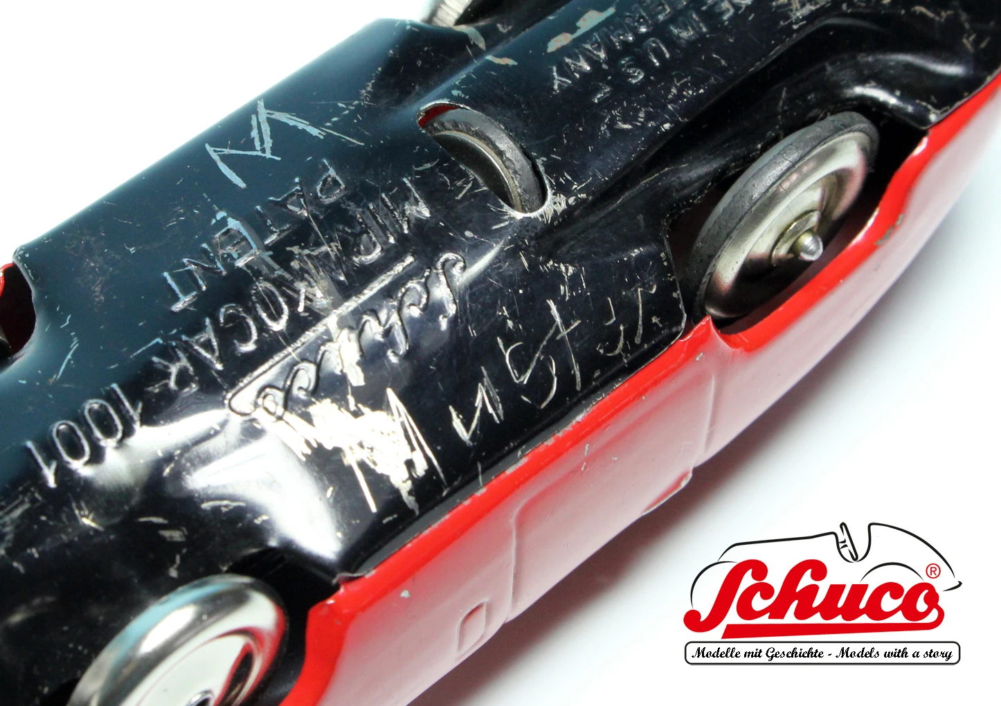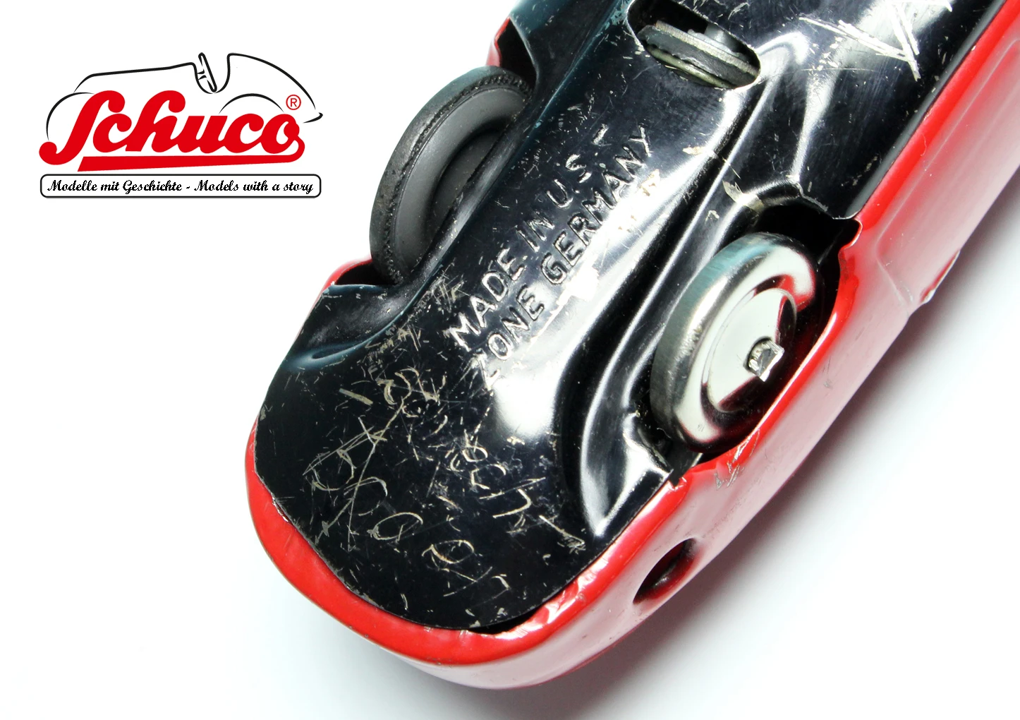 Baujahr ca. 1950er Jahre, Farbe rot, schöne Lackierung mit ein paar wenigen Spielspuren, insgesamt schöner Erhaltungszustand, Funktionen einwandfrei und getestet, Markierung auf der Bodenplatte „Made in U.S.-Zone Germany“, keinerlei Beschädigungen oder Beulen, alle verbauten Teile sind dem Baujahr des Modells entsprechend. Als Besonderheit besitzt dieses Modell eine Bodenplatte, auf der ein großer Buchstabe „M“ sowie unterhalb dessen das Wort „Muster“ eingeritzt wurde. Darüber hinaus wurden im hinteren Teil der Bodenplatte noch die beiden Wörter „Schlecht Boden“ eingeritzt.