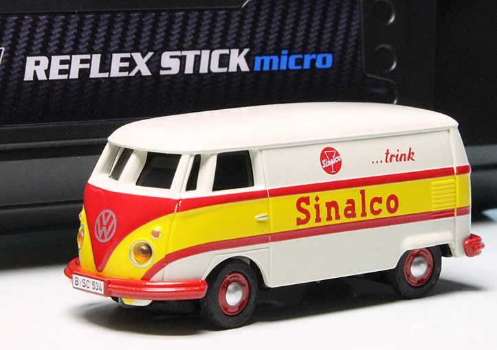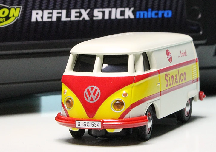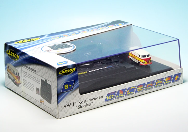 High-Tech im Kleinstformat. Die Entwickler von Carson haben all Ihre Erfahrung in die Entwicklung des neuen VW T1 Bulli einfließen lassen. So verfügt der Transporter im Maßstab 1:87 über eine störungsfreie 2.4 GHz Fernsteueranlage, die eine fein abgestimmte Steuerung (digital-proportional) von Gas und Lenkung mit Lenkungstrimmung zulässt. Der eingebaute Li-Ion Fahrakku ermöglicht eine Fahrzeit von bis zu 35 Minuten bei nur 30 Minuten Ladezeit und wird über den Power-Plug direkt am Sender geladen. Damit ist der kleine VW auch unterwegs immer fahrbereit. Durch seinen sehr kleinen Wendekreis fühlt sich der Nostalgiker alternativ zum Schreibtisch auch auf einer Eisenbahnanlage wohl und bringt somit auch neben den Gleisen Bewegung auf die Straße. Die detaillierte Lackierung und Bedruckung sowie funktionierende Fahr- und Rückleuchten runden den starken Auftritt des kleinen Klassikers ab und die technisch designte Fernsteuerung „Reflex Stick Micro“ bildet perfekt das Bindeglied zwischen Nostalgie und Moderne. Aufbewahrt werden Fahrzeug und Sender in einer mitgelieferten Vitrine. Vier AAA Senderbatterien vervollständigen den Lieferumfang zu einem 100 % Komplett-Set.