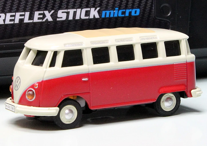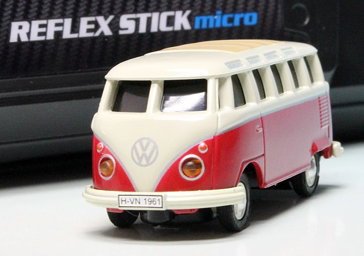 High-Tech im Kleinstformat. Die Entwickler von Carson haben all Ihre Erfahrung in die Entwicklung des neuen VW T1 Bulli einfließen lassen. So verfügt der Transporter im Maßstab 1:87 über eine störungsfreie 2.4 GHz Fernsteueranlage, die eine fein abgestimmte Steuerung (digital-proportional) von Gas und Lenkung mit Lenkungstrimmung zulässt. Der eingebaute Li-Ion Fahrakku ermöglicht eine Fahrzeit von bis zu 35 Minuten bei nur 30 Minuten Ladezeit und wird über den Power-Plug direkt am Sender geladen. Damit ist der kleine VW auch unterwegs immer fahrbereit. Durch seinen sehr kleinen Wendekreis fühlt sich der Nostalgiker alternativ zum Schreibtisch auch auf einer Eisenbahnanlage wohl und bringt somit auch neben den Gleisen Bewegung auf die Straße. Die detaillierte Lackierung und Bedruckung sowie funktionierende Fahr- und Rückleuchten runden den starken Auftritt des kleinen Klassikers ab und die technisch designte Fernsteuerung „Reflex Stick Micro“ bildet perfekt das Bindeglied zwischen Nostalgie und Moderne. Aufbewahrt werden Fahrzeug und Sender in einer mitgelieferten Vitrine. Vier AAA Senderbatterien vervollständigen den Lieferumfang zu einem 100 % Komplett-Set.